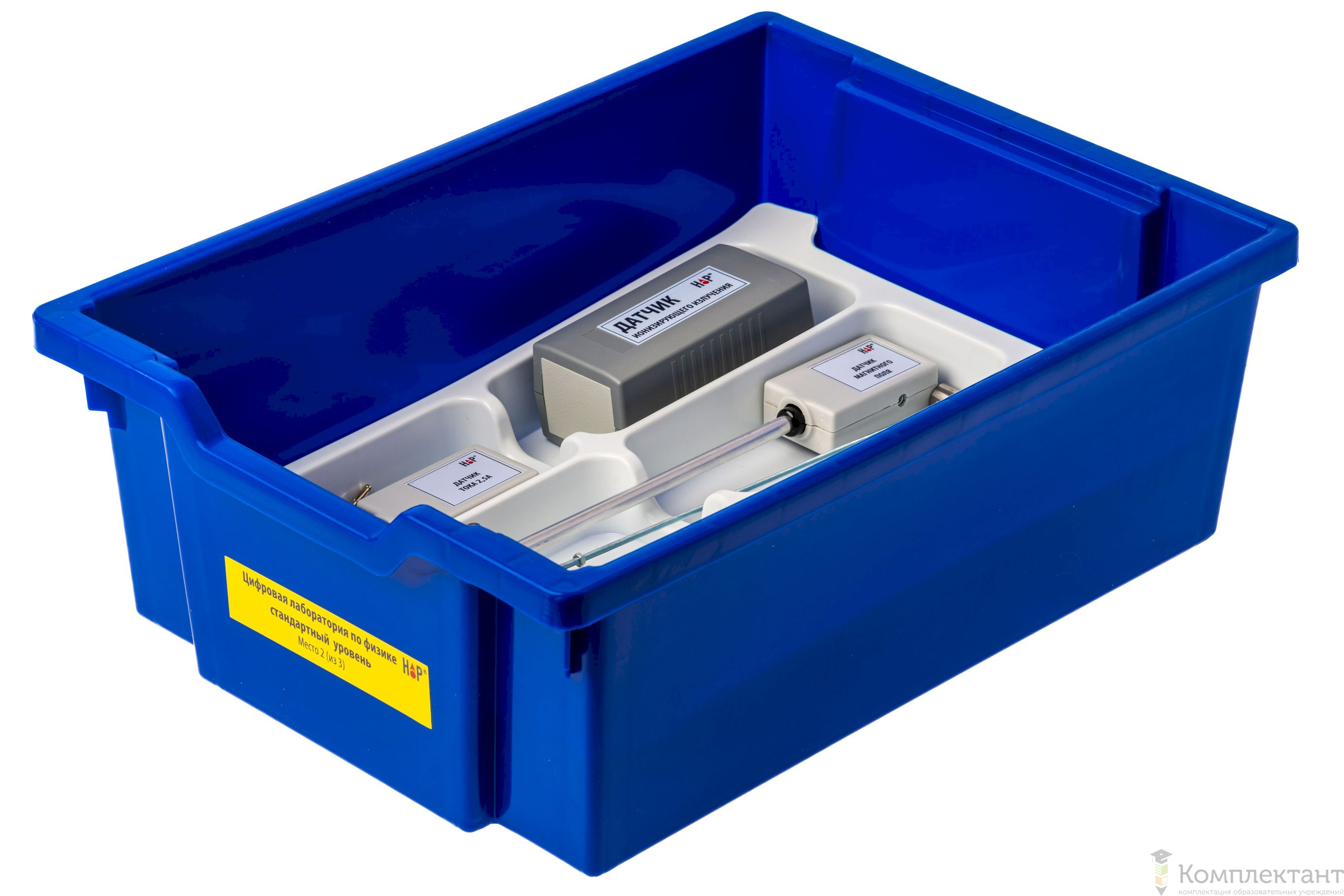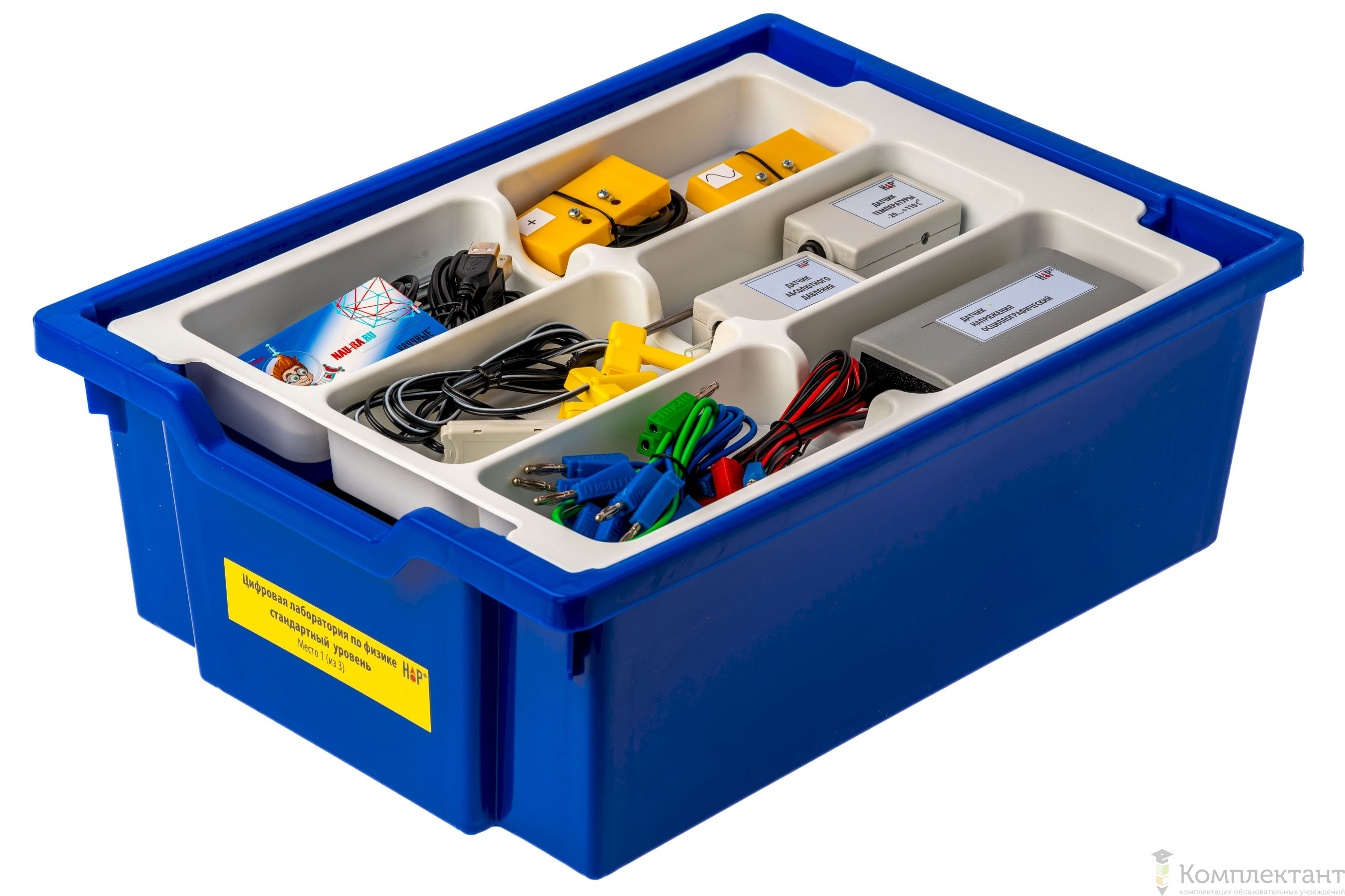 Все оборудование цифровой лаборатории (кроме скамьи лабораторной) укомплектовано в пластиковые системы хранения, которые закрываются прозрачной пластиковой крышкой на защелках для обеспечения наблюдения за содержимым. Комплект оборудования и датчики в системах хранения располагаются на ложементах в индивидуальных ячейках.